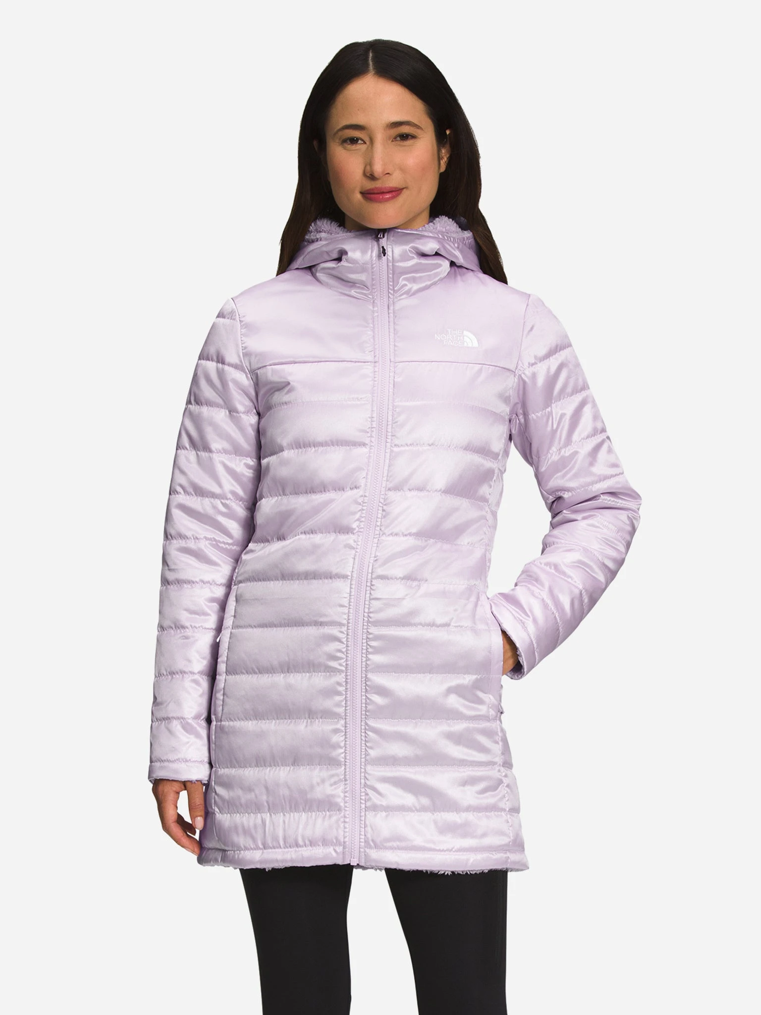 Insulated reversible parka featuring a wind-resistant, water-repellent exterior and a plush fleece interior.